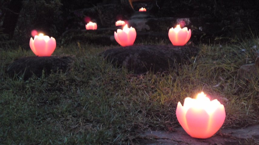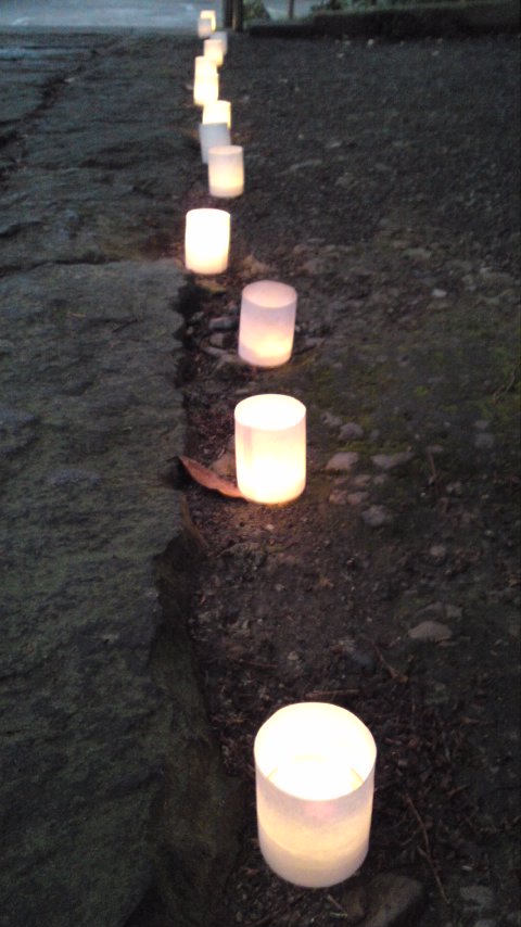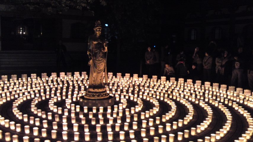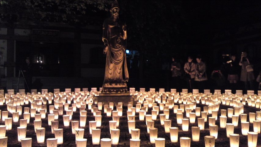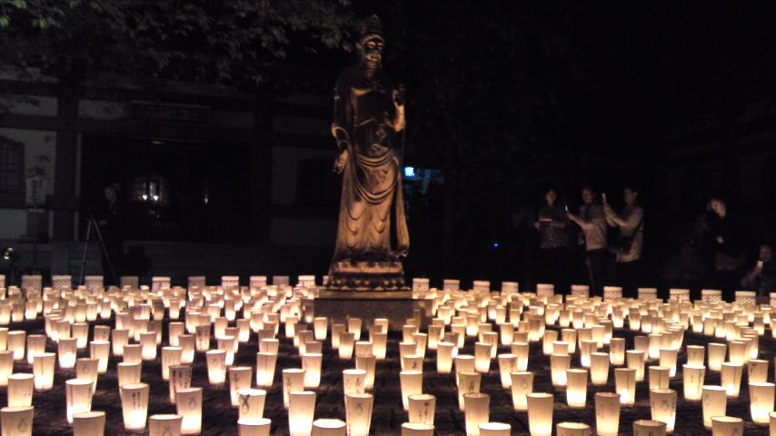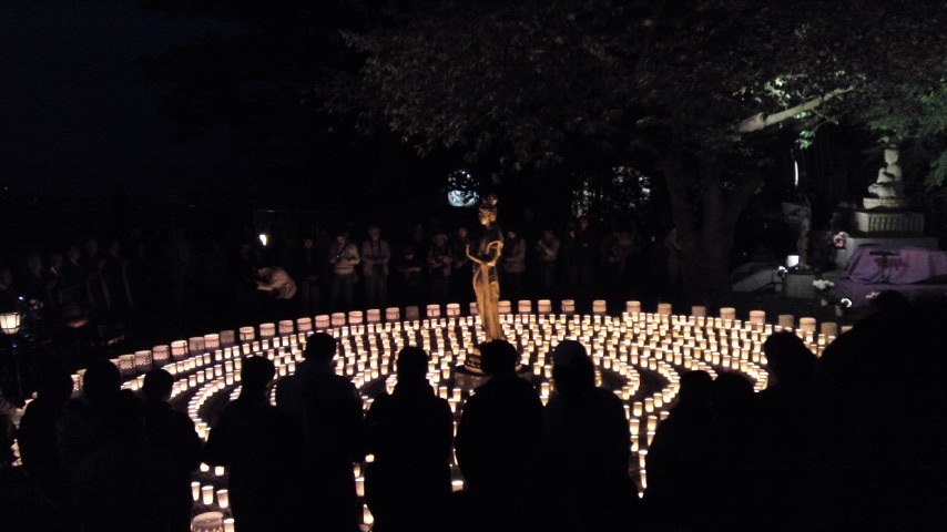 ろうそくの灯りに導かれながら山門をくぐって境内へ。