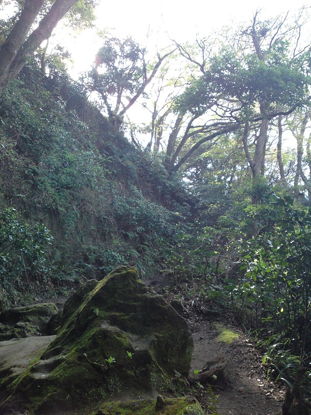 かなり急な坂をのぼると、コケに覆われた切通しの先に洞穴が見えてきます。